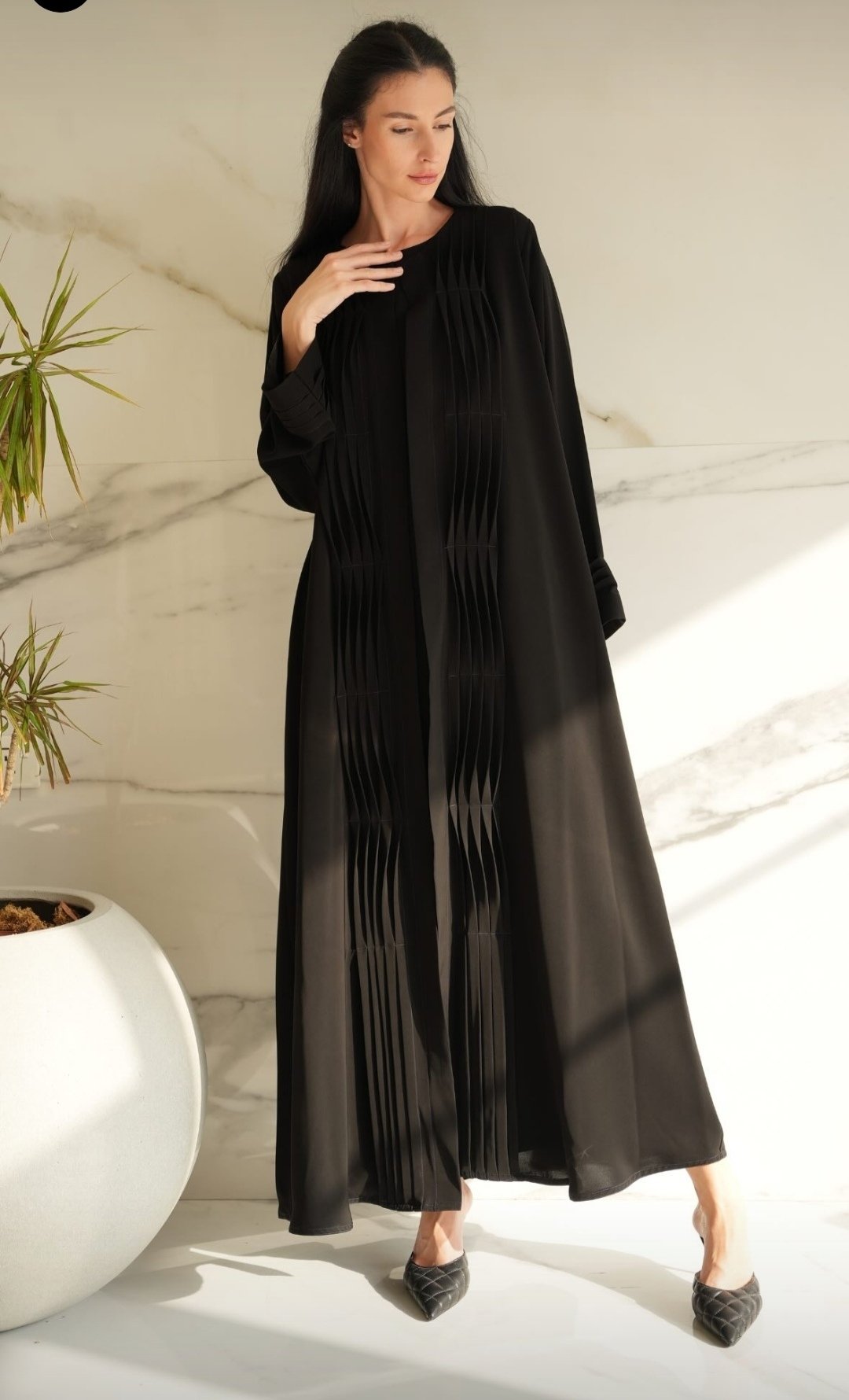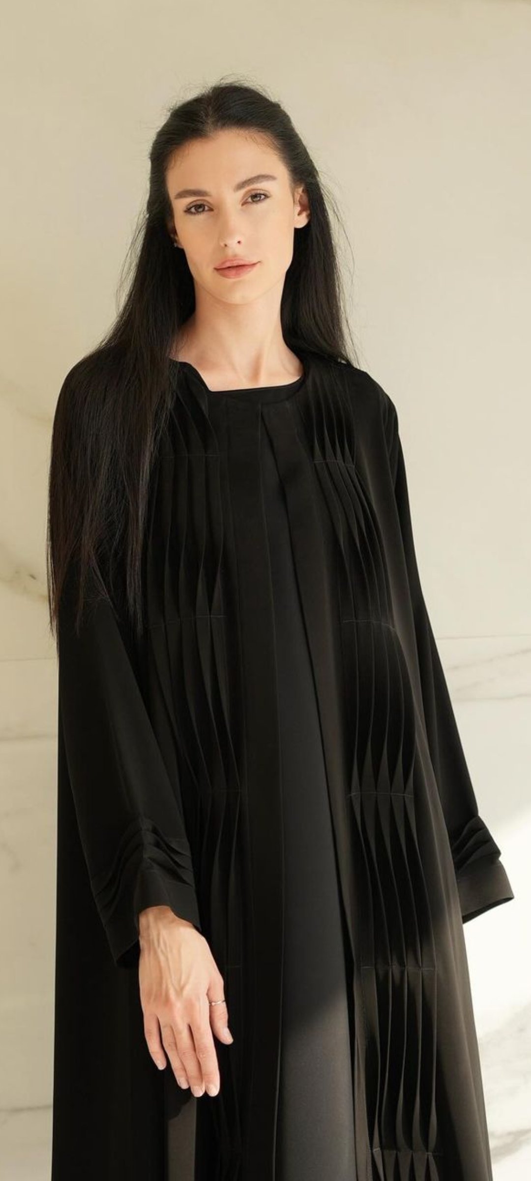 Beautiful daily wear abaya in fabric nada with tangled pleated design in sleeve end and front of the Abaya