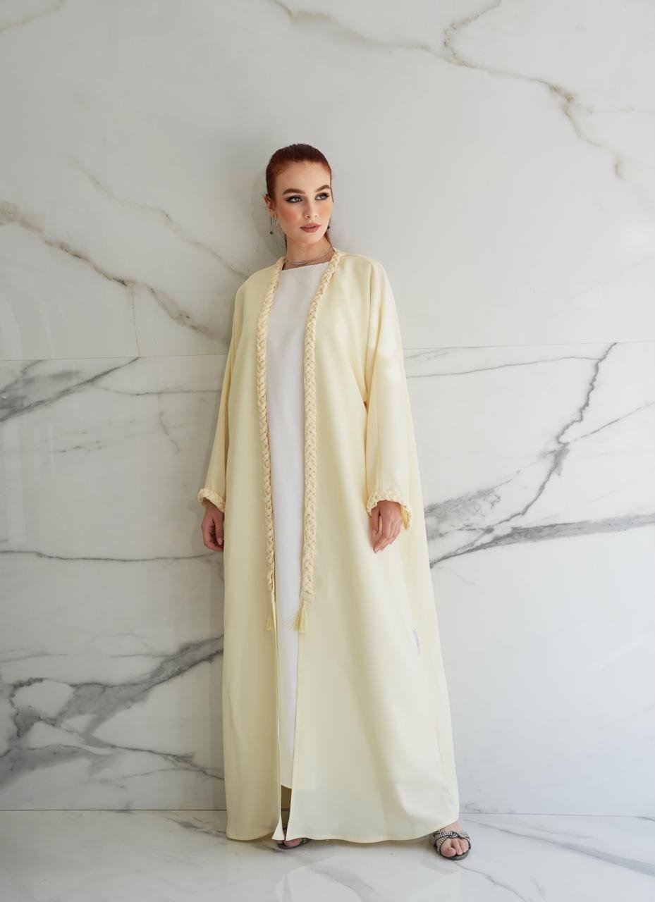 Beautiful light yellow shade Abaya in Premium crepe fabric with Thick Braid design